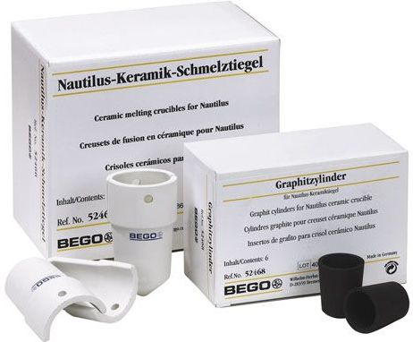 Keramik-Tiegel für das induktive Schmelzen in Nautilus-Guss-Geräten. Die Schmelztiegel bestehen aus quarzhaltiger Keramikmasse und haben eine sehr lange Lebensdauer. Glas-Kohlenstoff-Zylinder für Nautilus-Keramik-Schmelztiegel. Zum Schmelzen von Edelmetall-Legierungen, vor allem hochpalladiumhaltiger Legierungen.