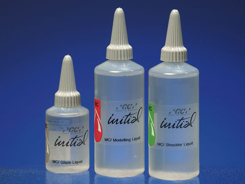 Flüssigkeiten zum Anmischen der jeweiligen Massen, wie Dentin-, Schneide-, Schulter-, Opaker- und Glasurmassen.